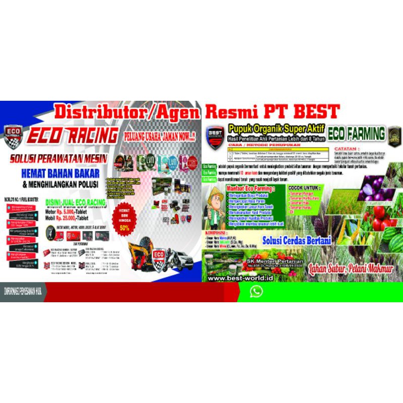 Eco Farming adalah pupuk atau nutrisi berbahan organik super aktif yang sudah mengandung unsur hara lengkap sesuai kebutuhan tanaman juga dilengkapi dengan bakteri positif yang akan menjadi biokatalisator dalam proses memperbaiki sifat fisik biologi dan kimia dalam rangka mengembalikan kesuburan tanah. Eco racing nano tech. Spanduk Eco Racing.